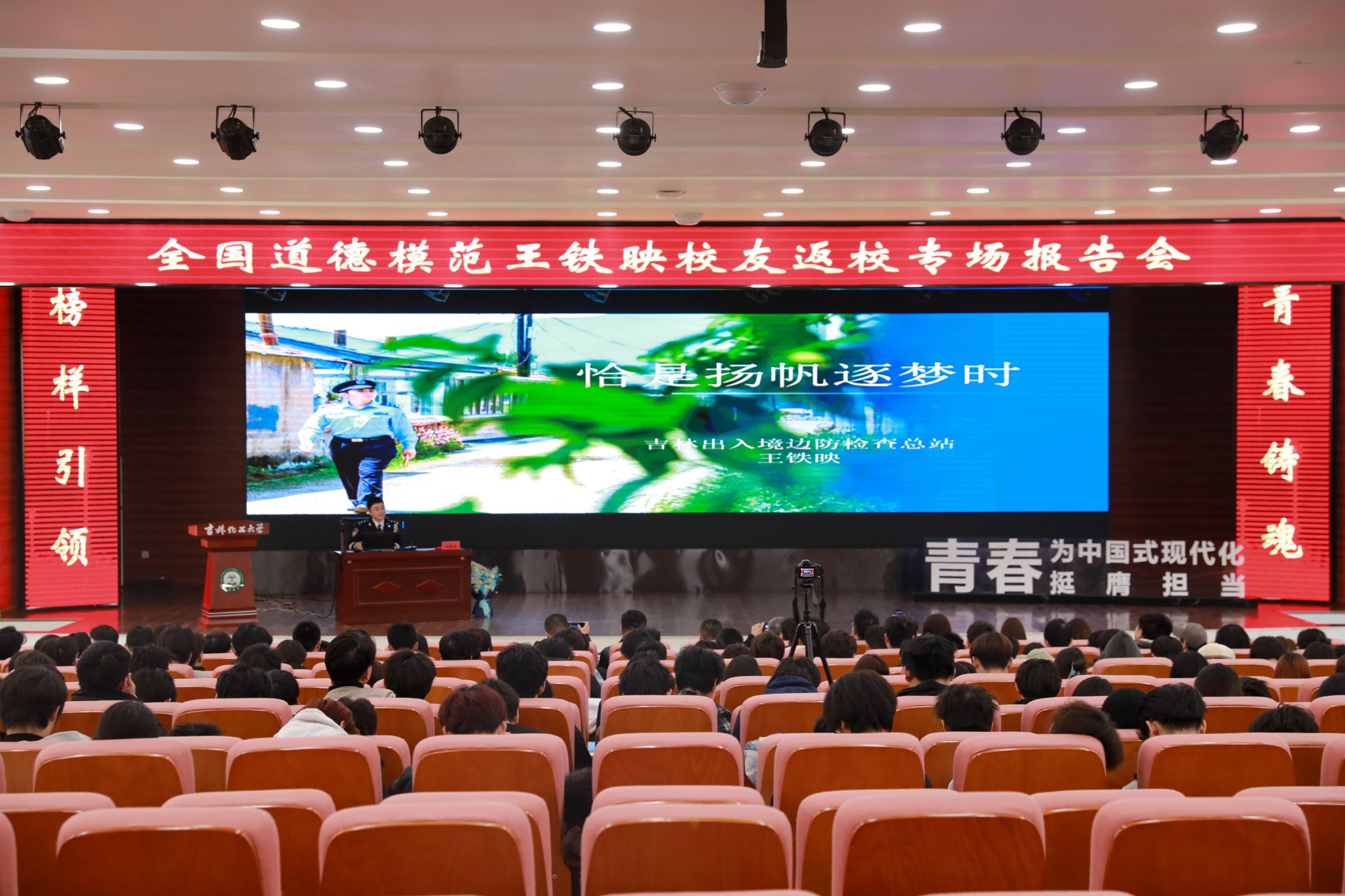 在随后召开的报告会上,王铁映以《恰是扬帆逐梦时》为题作主题宣讲。他结合自身成长经历,深情回顾了在母校求学时的点滴往事,分享了工作以来坚守初心、服务人民的感人事迹,勉励学弟学妹珍惜韶华、坚定理想、勇于担当,在中国式现代化建设的新征程上书写无悔青春。