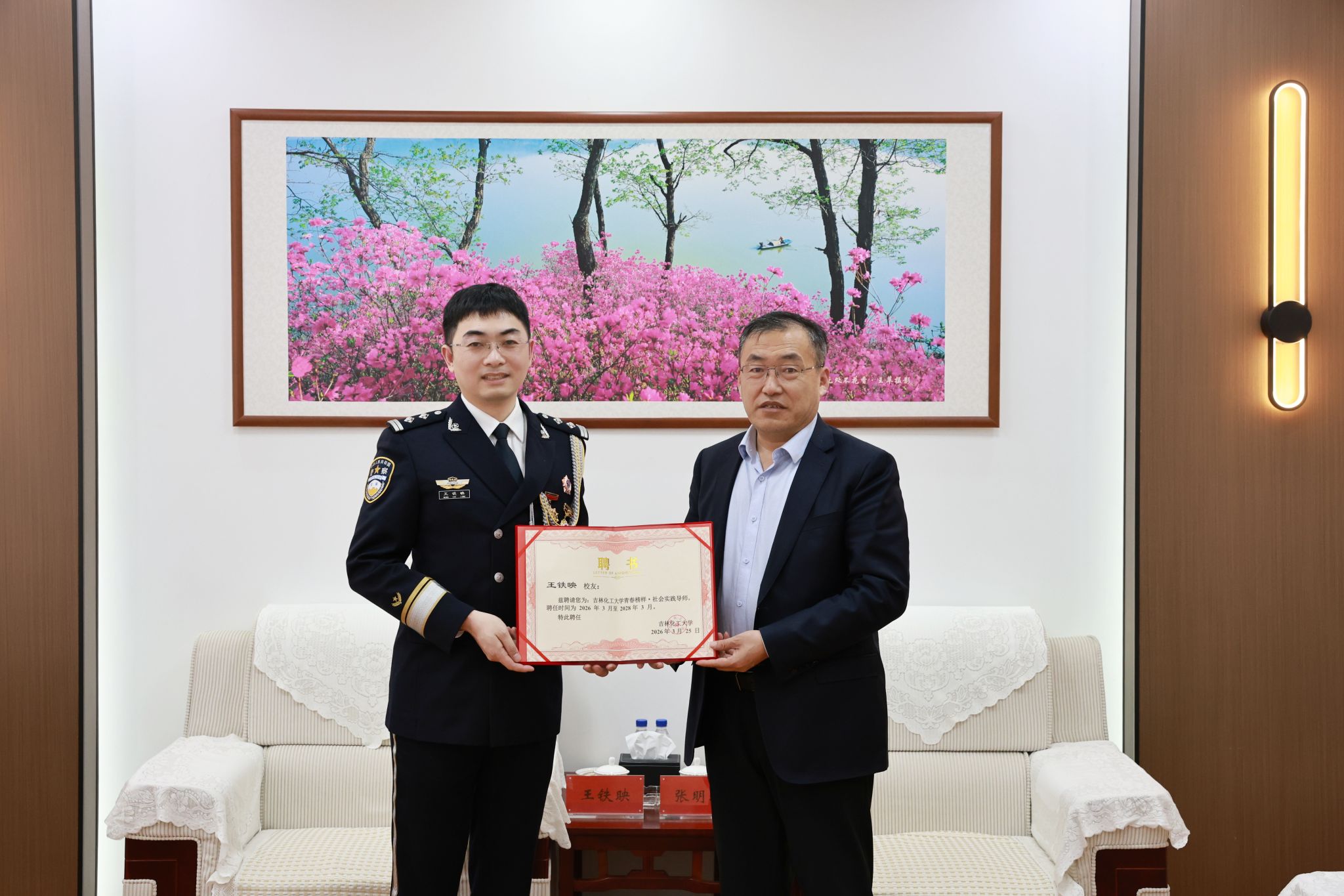 张明耀为王铁映校友颁发“‘青春榜样 社会实践’导师”聘书,殷切勉励他继续发挥榜样示范引领作用,用自身经历和精神力量,引导在校学生坚定理想信念、锤炼过硬本领、勇于担当作为,助力青年学子成长成才、逐梦前行。