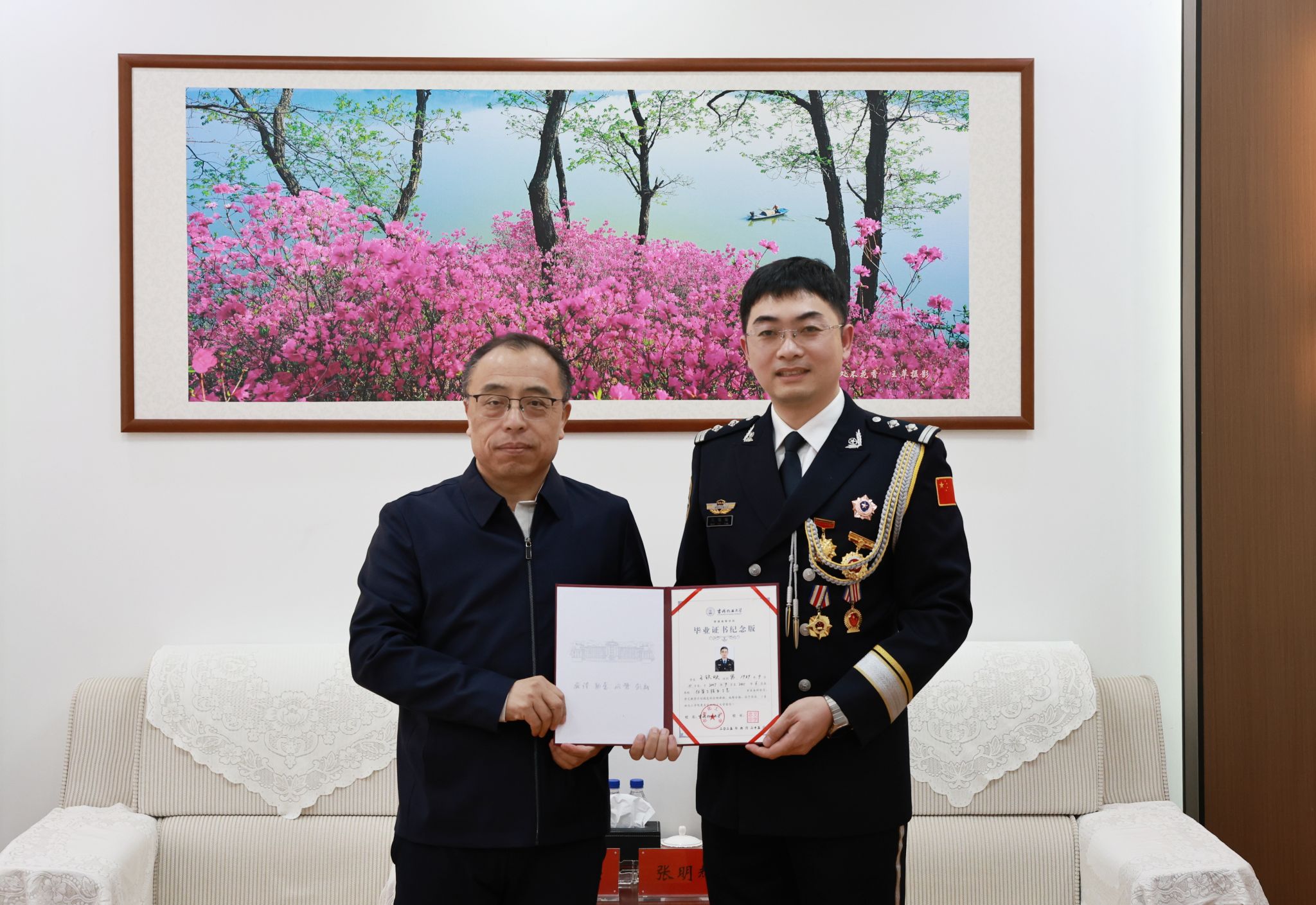 艾学忠为王铁映校友颁发“吉林化工大学纪念版毕业证书”,这份特殊的证书承载着母校对校友的深切关怀与美好期许,凝聚着母校与校友之间难以割舍的深厚情谊,既是对他在校期间勤奋求学的肯定,也是对他毕业后砥砺奋进、成就卓越的赞誉。